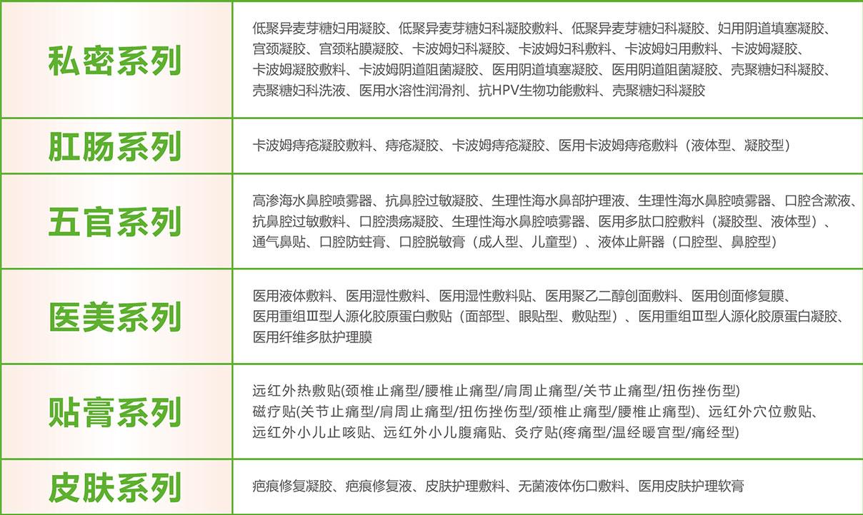 集團(tuán)業(yè)務(wù)板塊主要有:二類醫(yī)療器械、消字號、妝字號、保健食品、健字號、日用號等大健康全系列產(chǎn)品。佰氏健康集團(tuán)擁有的二類醫(yī)療器械批文有上百個,涉及私密系列、肛腸系列、五官系列、醫(yī)美系列、貼膏系列、皮膚系列等。涉及的產(chǎn)品可見下圖。