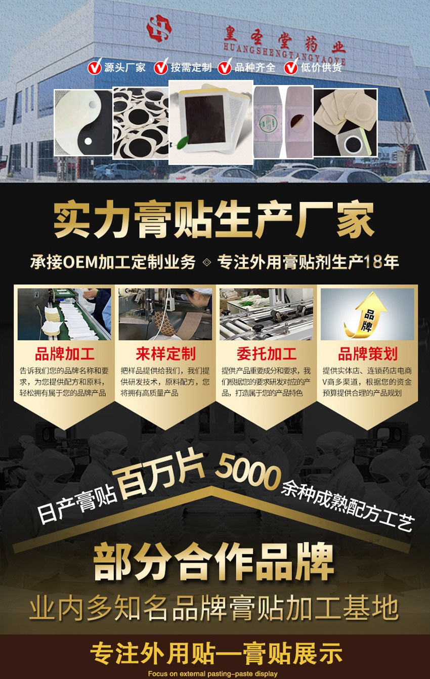 OEM代加工特點OEM.自主品牌加工只需要告訴我們您的品牌名稱,輕松擁有專屬黑膏藥品牌,還可以來料黑膏藥加工,包裝加工,來樣加工,來配方加工。