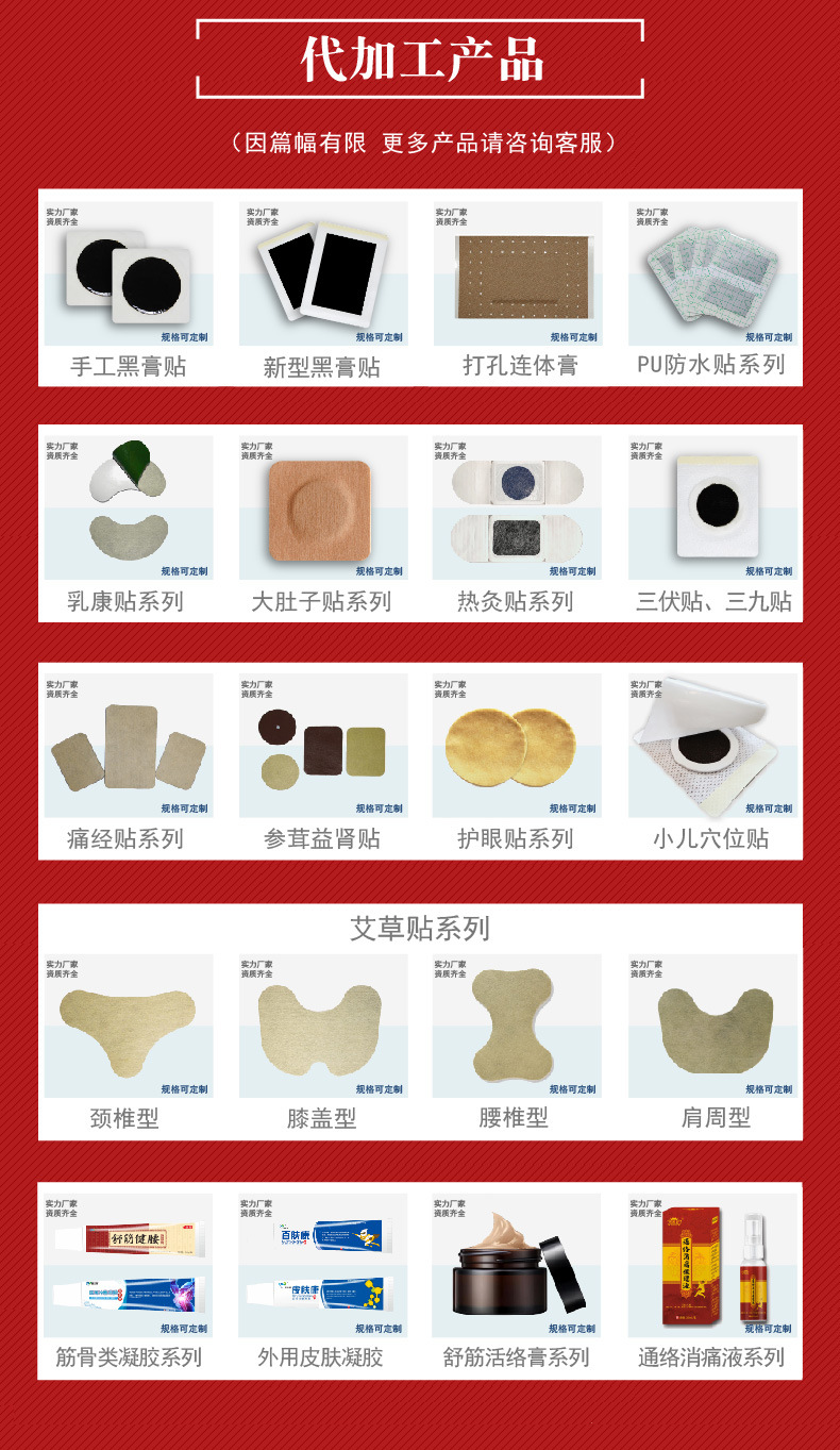 [主營產(chǎn)品]:膏藥貼劑,藥水,藥膏,藥粉,黑膏藥,藥貼牌代加工,水 乳 霜 精華美容護(hù)膚產(chǎn)品oem/odm代加工 更多>