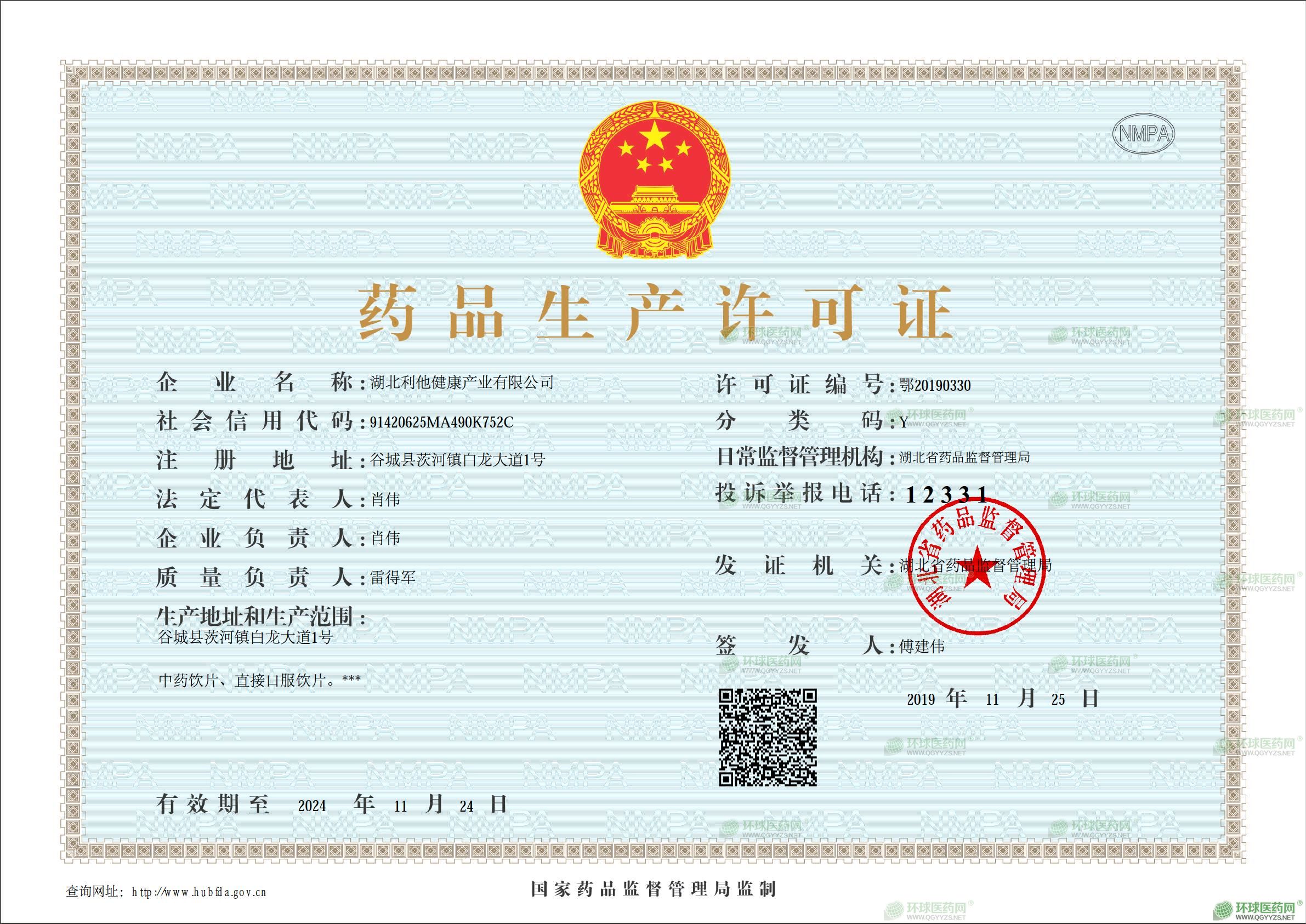 發(fā)證機關(guān): 湖北省藥品監(jiān)督管理局