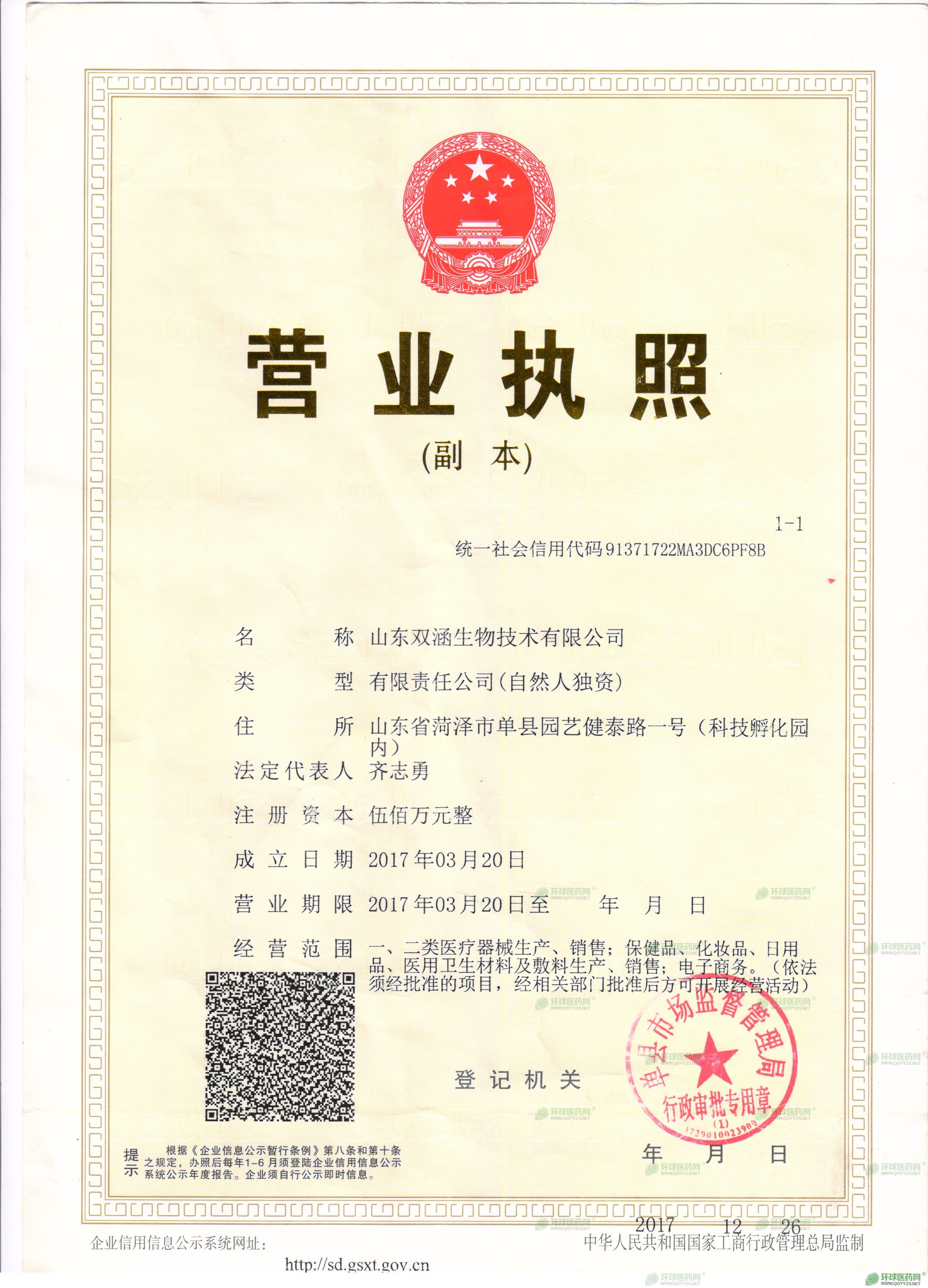 山東雙涵生物技術(shù)有限公司始創(chuàng)于2017年,是一家集研發(fā)、生產(chǎn)、銷售于一體、按高起點(diǎn),高標(biāo)準(zhǔn)建立起來(lái)的創(chuàng)新型現(xiàn)代化企業(yè),座落于蘇魯豫皖四省八縣交界之處、著名長(zhǎng)壽之鄉(xiāng)——中國(guó)單縣。注冊(cè)資金500萬(wàn)元,擁有在冊(cè)員工50人,科研人員5人,本科及以上10人。公司以“保護(hù)健康、造福社會(huì)”為企業(yè)使命,以“品質(zhì)至上、科學(xué)發(fā)展”為企業(yè)核心價(jià)值觀,以“傳承、創(chuàng)新、和諧、奉獻(xiàn)”為企業(yè)精神,以“務(wù)實(shí)、求嚴(yán)、高效、誠(chéng)信”為企業(yè)作風(fēng)。公司擁有規(guī);a(chǎn)基地,主營(yíng)產(chǎn)品:醫(yī)用退熱貼、透氣膠貼、創(chuàng)口貼、壓敏膠帶、醫(yī)用冷敷貼、噴劑輔料、冷敷凝膠、傷口護(hù)理軟膏、穴位壓力刺激貼、醫(yī)用冷敷眼罩、隔離衣、醫(yī)用隔離鞋套、醫(yī)用帽、液體敷料等。
