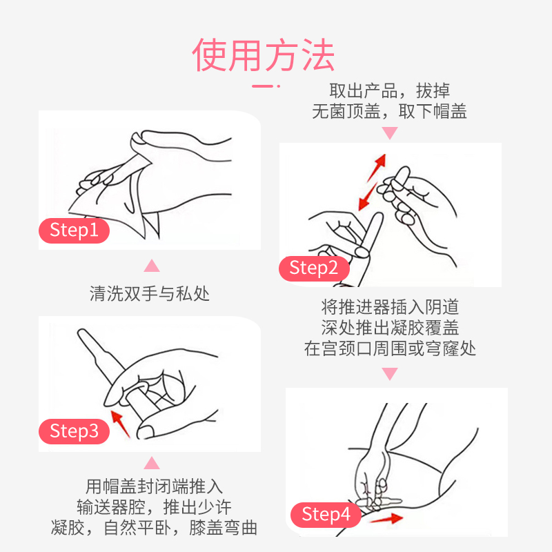 【使用方法】晚上睡前清洗外陰后,打開包裝、取出產(chǎn)品,拔掉無菌頂蓋、取下蓋帽,用蓋帽封閉端推入輸送器腔,推出少許凝膠,自然平臥位。膝蓋彎曲,將推進器插入陰道深處推出凝膠覆蓋在宮頸口周圍或穹窿處,抽出輸送器棄之。1支/次,1次/日,嚴重者2支/日,早晚各一支或者遵醫(yī)囑。6支為一個療程,一般1到2個療程創(chuàng)面修復。