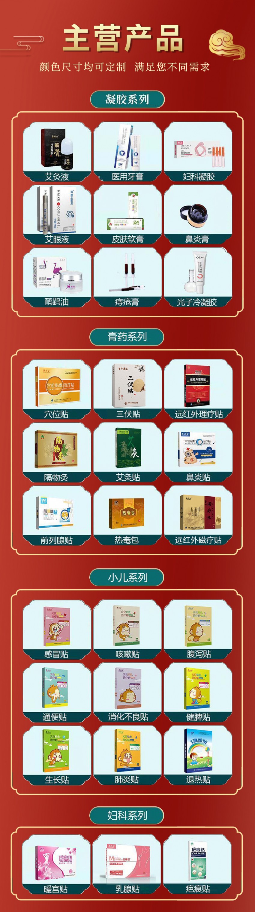 日照海旭醫(yī)療器械有限公司專業(yè)生產(chǎn)械字號(hào)一二類貼劑膏藥、傳統(tǒng)黑膏藥、遠(yuǎn)紅外理療貼、磁療貼、穴位貼敷治療貼、醫(yī)用冷敷貼、灸熱貼、暖宮貼、隔物灸、艾灸貼足貼、蒸汽眼罩、冷敷眼貼、退熱貼、小兒貼、中醫(yī)穴位透皮貼,沙蒿子透皮貼、無菌敷貼,乳膏,婦科洗液,臭氧油等消殺類產(chǎn)品,以及化妝品等微商、臨床、終端、店面等可以操作的產(chǎn)品;膏藥加工、膏藥批發(fā)的主要有以下幾種: 1、退熱貼、感冒貼、腹瀉貼、咳喘貼、厭食貼;2、遠(yuǎn)紅外理療貼,遠(yuǎn)紅外磁療貼(頸腰椎病、風(fēng)濕、類風(fēng)濕關(guān)節(jié)炎、骨質(zhì)增生、肩周炎、腰肌勞損、坐骨神經(jīng)痛);3、暖宮貼、卵巢保養(yǎng)貼、乳腺貼、痛經(jīng)貼;4、提神醒腦貼、減肥貼、腸胃貼、鼻咽炎貼、止痛貼;5、隔物灸、熱奄包、耦合劑、無菌貼、透皮貼、艾灸液、灸熱貼等。