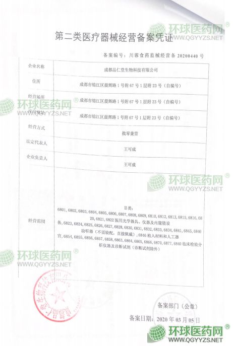 成都品仁堂生物科技有限公司成立于2013年06月20日,注冊地位于四川省成都市錦江區(qū)晨輝路1號附67號1層附23號(自編號),法定代表人為王可成。經(jīng)營范圍包括生物制劑、化工醫(yī)藥產(chǎn)品的技術研究及技術轉讓;銷售:保健用品、衛(wèi)生用品、化妝品、計生用品、日用品、醫(yī)療器械Ⅰ類、醫(yī)療器械Ⅱ類、消毒用品、電子產(chǎn)品;食品經(jīng)營。(依法須經(jīng)批準的項目,經(jīng)相關部門批準后方可開展經(jīng)營活動)