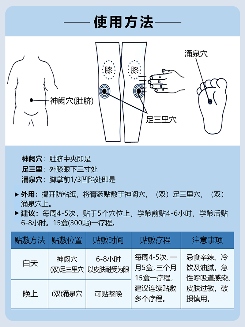 使用方法:將使用部位清洗干凈,將球狀體對準穴位點(神闕、足三里、涌泉穴及配伍穴位)進行貼壓,按壓邊緣,粘貼牢固即可;貼敷時間:學齡前2-4小時;學齡后6-8小時;以皮膚耐受為限。