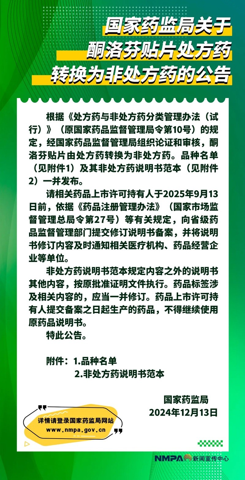 12月17日,國家藥監(jiān)局發(fā)布《關(guān)于酮洛芬貼片處方藥轉(zhuǎn)換為非處方藥的公告》,經(jīng)國家藥品監(jiān)督管理局組織論證和審核,酮洛芬貼片由處方藥轉(zhuǎn)換為非處方藥。