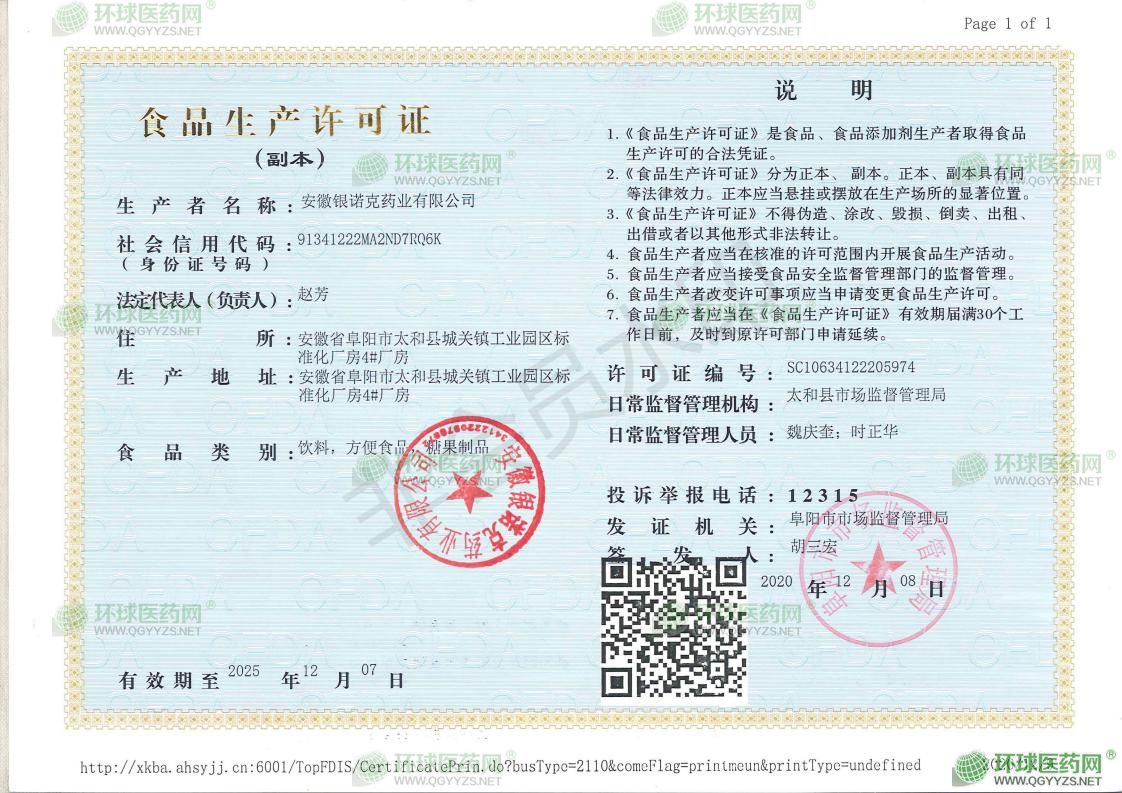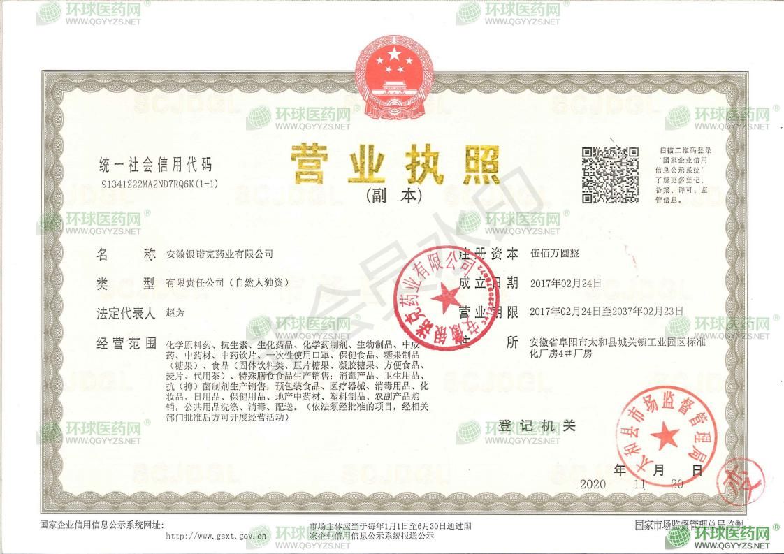 安徽銀諾克藥業(yè)有限公司成立于2017年02月24日,注冊(cè)地位于安徽省阜陽(yáng)市太和縣城關(guān)鎮(zhèn)工業(yè)園區(qū)標(biāo)準(zhǔn)化廠房4#廠房,法定代表人為趙芳。經(jīng)營(yíng)范圍包括化學(xué)原料藥、抗生素、生化藥品、化學(xué)藥制劑、生物制品、中成藥、中藥材、中藥飲片、一次性使用口罩、保健食品、糖果制品(糖果)、食品(固體飲料類、壓片糖果、凝膠糖果、方便食品、麥片、代用茶)、特殊膳食食品生產(chǎn)銷售;消毒產(chǎn)品、衛(wèi)生用品、抗(抑)菌制劑生產(chǎn)銷售,預(yù)包裝食品、醫(yī)療器械、消毒用品、化妝品、日用品、保健用品、地產(chǎn)中藥材、塑料制品、農(nóng)副產(chǎn)品購(gòu)銷,公共用品洗滌、消毒、配送。(依法須經(jīng)批準(zhǔn)的項(xiàng)目,經(jīng)相關(guān)部門批準(zhǔn)后方可開展經(jīng)營(yíng)活動(dòng))
