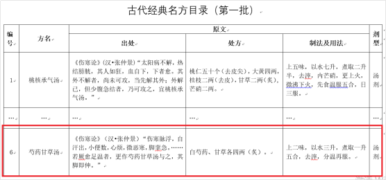 2018年4月13日國(guó)家中醫(yī)藥管理局發(fā)布《古代經(jīng)典名方目錄(第 一批)》,其中第六首方劑就是“芍藥甘草湯”。