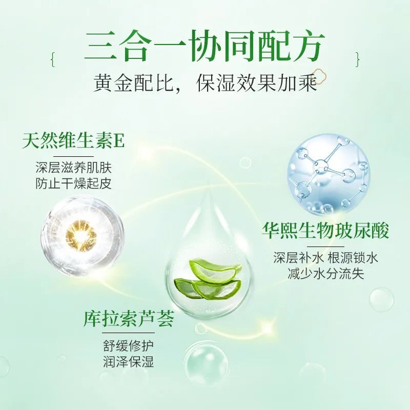 我們再來了解下它的其他成分,在核心成分庫拉索蘆薈的基礎(chǔ)上搭配有天然維生素E可深層滋養(yǎng)肌膚、防止干燥起皮及華熙生物玻尿酸能從肌膚深層補水、根源鎖水,極大的提升了皮膚的鎖水能力,這三者三合一協(xié)同配方,黃金配比,保濕效果大大提升!