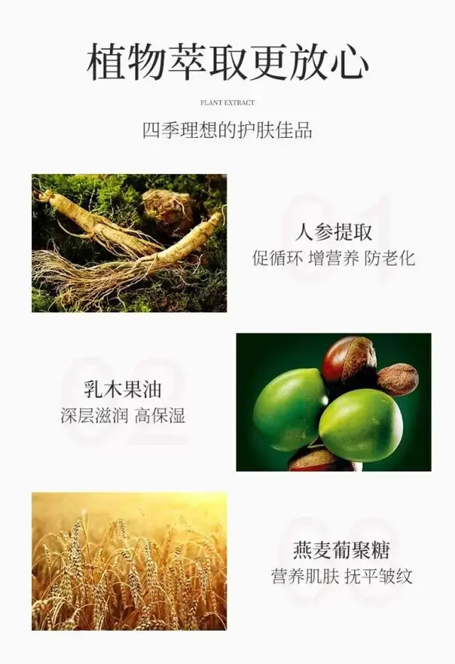 其中人參提取物可促循環(huán),增營養(yǎng),防老化;乳木果油對肌膚具有極好的保濕滋潤作用;燕麥葡聚糖具有營養(yǎng)肌膚、撫平皺紋的功效!