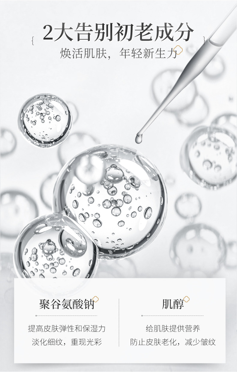 1、聚谷氨酸鈉X肌醇:給肌膚提供足夠的營(yíng)養(yǎng),可防止細(xì)胞老化、淡化肌膚細(xì)紋和皺紋;雙重抵御初老。從而由內(nèi)而外改善肌膚干紋皺紋。