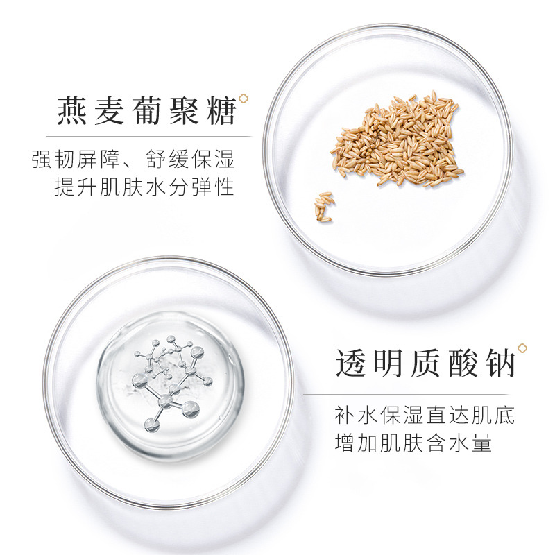 3、透明質(zhì)酸鈉X燕麥葡聚糖:強(qiáng)韌皮膚屏障,深層補(bǔ)水保濕,提高皮膚彈性。