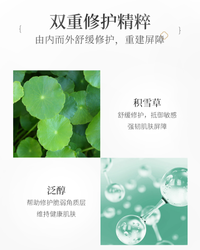 4、雙重修護(hù)成分:其中積雪草能起到舒緩修護(hù),抵御敏感,強(qiáng)韌肌膚屏障的作用,而泛醇能幫助修護(hù)脆弱角質(zhì)層,維持肌膚的健康!