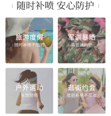 古草凝萃防曬噴霧適用于室內(nèi)室外等場合,一年四季保護(hù)肌膚。