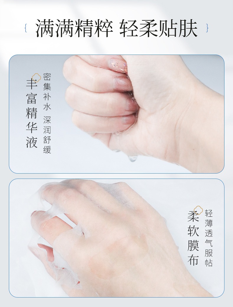 正因?yàn)橛幸陨蠋追N重要優(yōu)質(zhì)的成分加之優(yōu)質(zhì)的膜布,還有運(yùn)用了國際先進(jìn)的酶切法技術(shù),古草凝萃透明質(zhì)酸鈉保濕貼的精華液成分能夠抵達(dá)肌膚肌底層,直接被人體吸收利用,構(gòu)建肌底膠原;能有效改善皮膚干燥、蛻皮等問題,增加肌膚光澤。還原你的澎彈水潤!