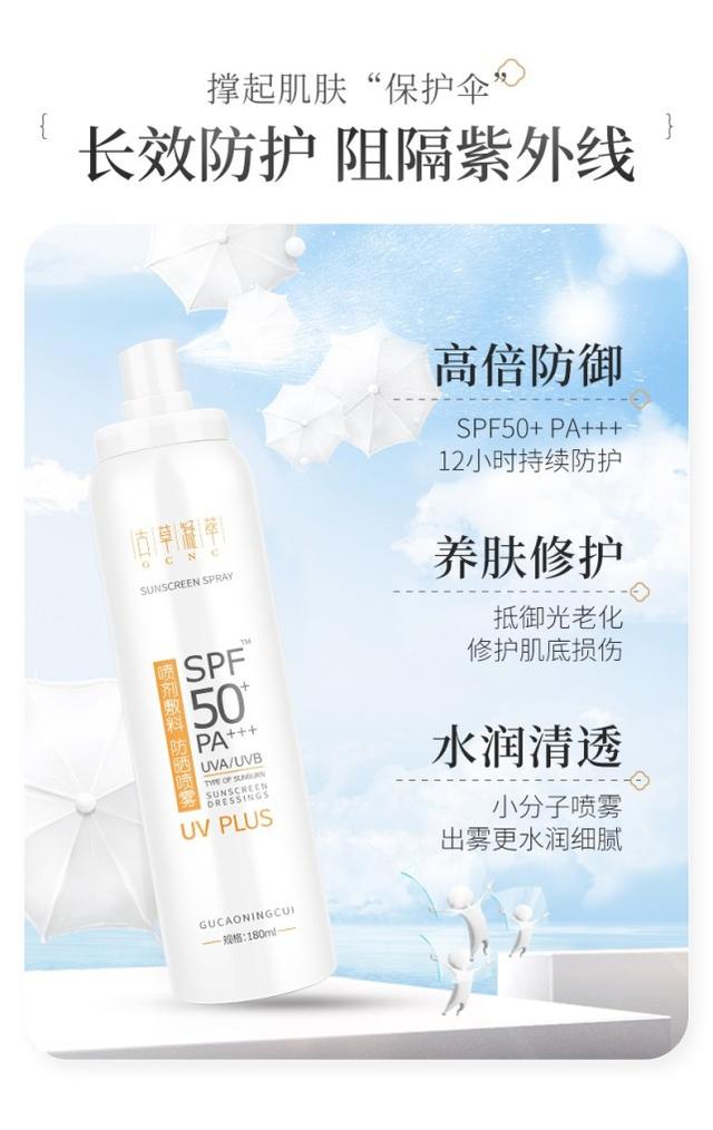 有一個防曬專題說,防曬做不對,一夏老十歲,甚至有小伙伴在下面留言說她一個夏天要用掉5瓶防曬品,才能讓自己不被曬黑曬傷。俗話說:護膚不防曬,一切白來,防曬擦不夠,衣服穿不厚!烈日炎炎下,還好有這款防曬法寶---古草凝萃防曬噴霧,隔離+防曬高倍數(shù)防護,美白補水,質(zhì)地輕薄易吸收,呵護夏日肌膚依舊白嫩水潤!它適合幾乎**的膚質(zhì),防曬指數(shù)高達SPF50+,PA+++,這是一年四季都適用的防曬品。
