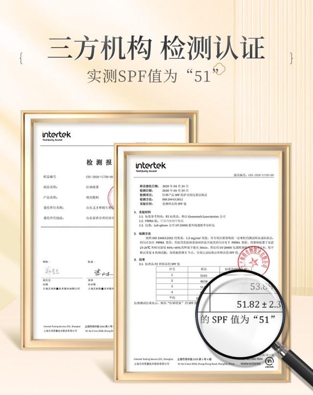 從以上成分可以總結到古草凝萃防曬噴霧的用料是極其精簡的,除了高效防曬功效外,還具補水保濕,減淡色素,抵御皺紋,修護肌底損傷等多重功效,防護的同時更滋養(yǎng)肌膚。古草凝萃防曬噴霧更是一款全波段防曬品,高達SPF50+(有第三方機構檢測認證,實測為51)PA+++的防曬指數(shù)!