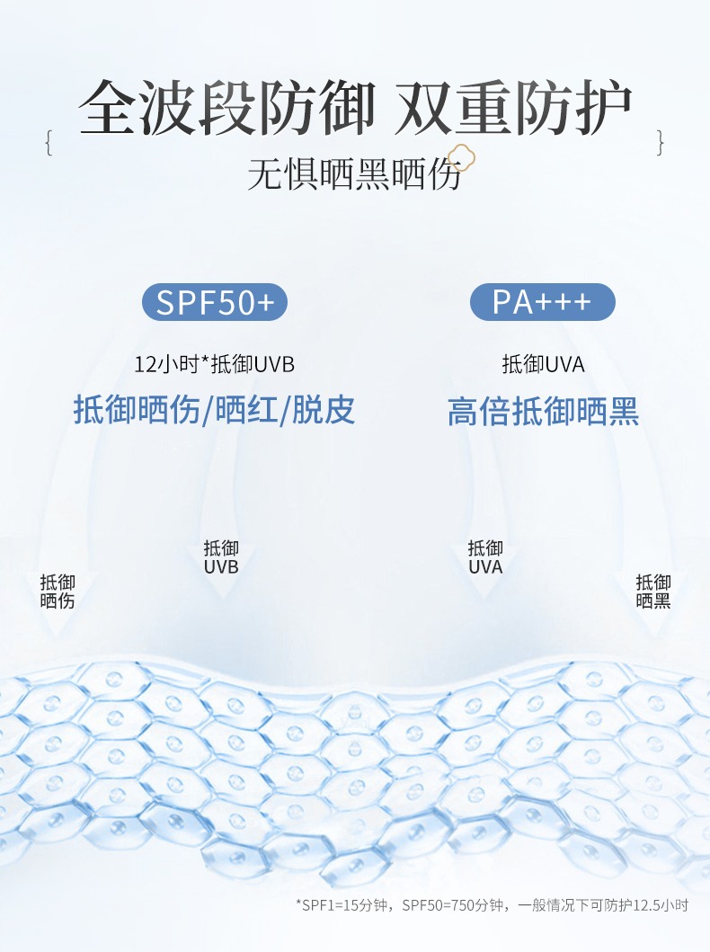 它具有SPF50+ PA+++的高防曬值,能長達12小時出色抵御UVA/UVB,撐起肌膚“保護傘”,可有效防止曬黑、曬傷、曬紅還可防止曬老!令肌膚自然保鮮年輕!