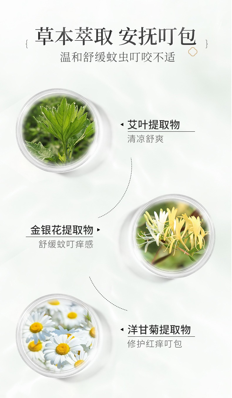 古草凝萃蚊痱噴霧還含有以下三種草本萃取成分,如果被蚊蟲叮咬后能溫和舒緩不適感,還具有很好的修護作用!