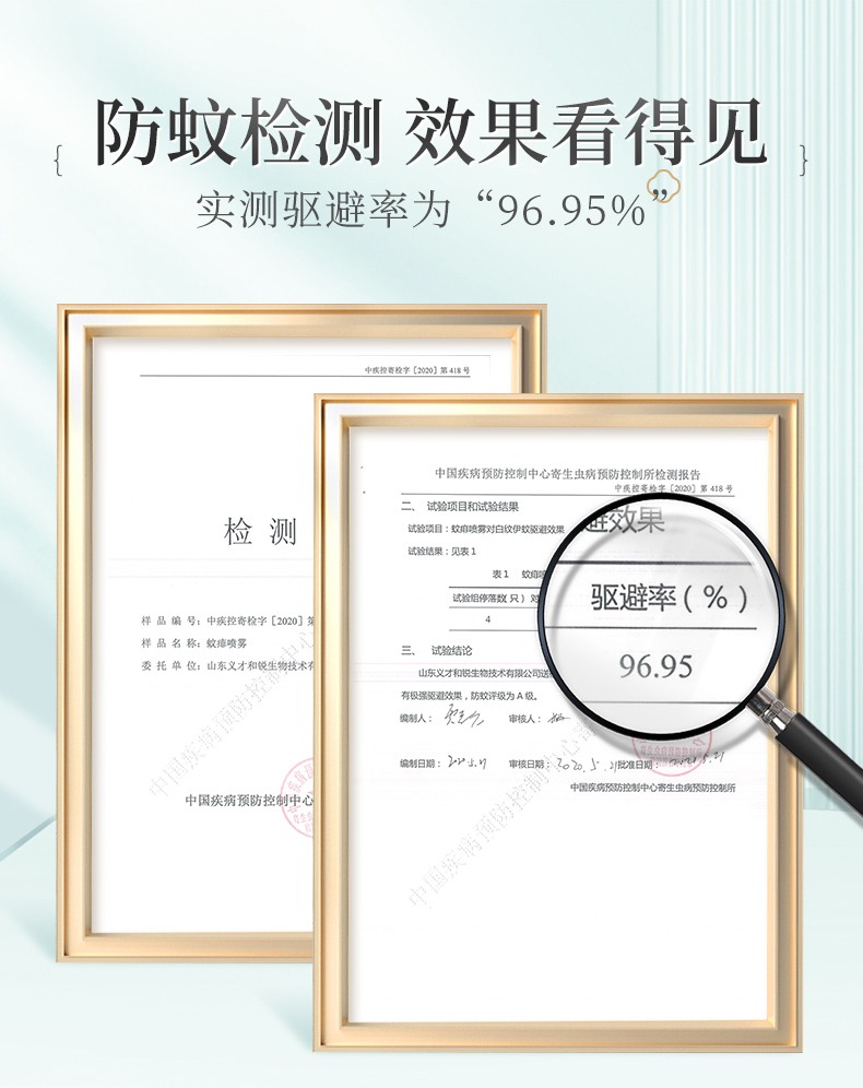 更重要的,古草凝萃蚊痱噴霧具備權(quán)威部門---中國疾病預(yù)防控制中心的檢測報告!實測驅(qū)避率高達96.95%!