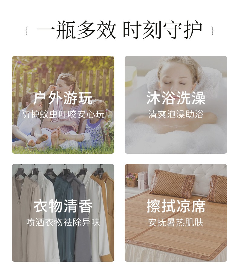 古草凝萃蚊痱噴霧具多種功效,能時刻守護你的健康!除了驅(qū)蚊,它可以在沐浴的時候噴入水中,沐浴驅(qū)蚊兩不誤,給全身清爽的感覺!還可以噴灑在衣物上祛除異味,在夏季擦拭涼席,安撫暑熱肌膚!