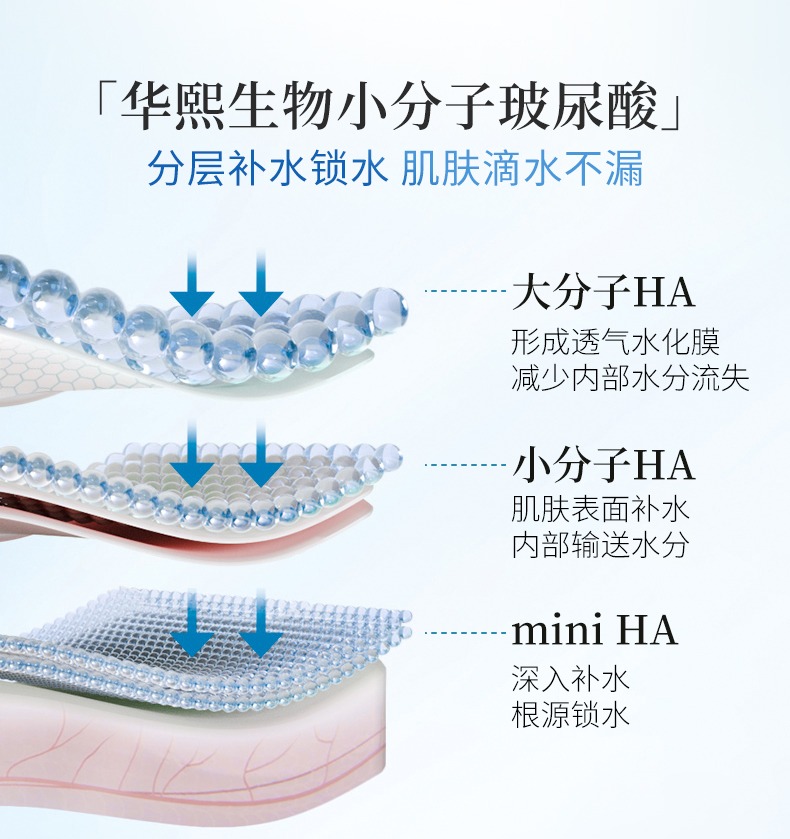 古草凝萃透明質(zhì)酸鈉保濕還添加有一項(xiàng)專利成分,那就是華熙生物研發(fā)的小分子玻尿酸,其中大分子HA能形成透氣水化膜,減少內(nèi)部水分流失;小分子HA可在肌膚表面補(bǔ)水同時(shí)在肌膚內(nèi)部輸送水分;miniHA能直達(dá)肌底層深入補(bǔ)水?稍谄つw上構(gòu)建立體網(wǎng)狀儲(chǔ)水海綿層,精準(zhǔn)定位皮膚的不同層次,外層補(bǔ)水,內(nèi)層鎖水,層層保濕,層層修護(hù)。