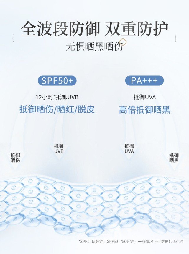 UVB會(huì)使皮膚在短時(shí)間內(nèi)曬傷、曬紅。防曬品包裝上的SPF值就是UVB防護(hù)能力的說(shuō)明,數(shù)值越大,防護(hù)時(shí)間越長(zhǎng)。