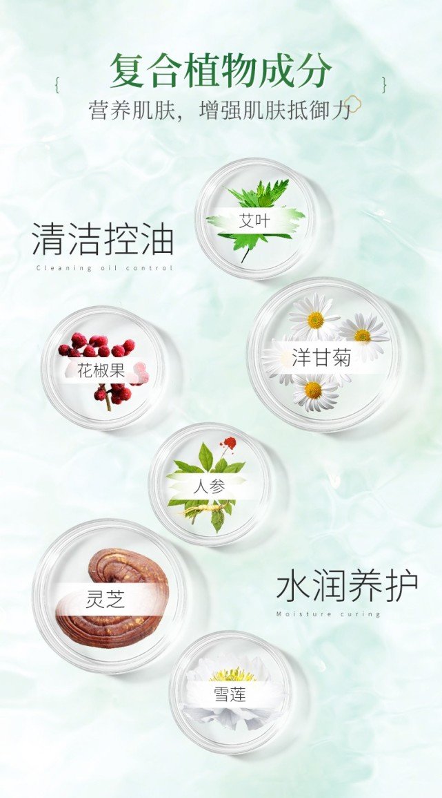復(fù)合多重植物成分,其中包括有艾葉、洋甘菊,花椒果,人參,靈芝、雪蓮,能營(yíng)養(yǎng)肌膚,增強(qiáng)肌膚抵御力。