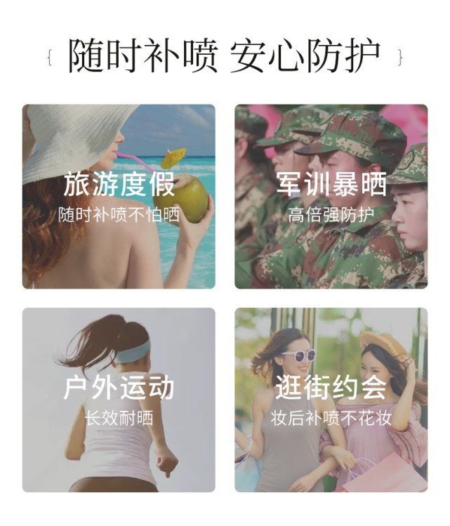 使用前搖一搖,一噴一抹,清爽不粘膩,實現(xiàn)肌膚呼吸自由,高倍防護一整天,外出游玩常備!