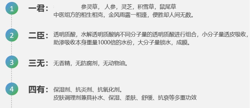 綜上所述,古草凝萃[子約美麗]補(bǔ)水四件套采用中藥復(fù)方、生物科技研制,復(fù)配參靈草、透明質(zhì)酸、人參、靈芝、積雪草等優(yōu)質(zhì)成分,具深層補(bǔ)水保濕、抗衰緊致、舒緩修護(hù)等多重功效!