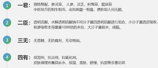添加了“華熙生物”研發(fā)的玻尿酸,其中大分子在皮膚表面抓取空氣中水分,讓皮膚處于保濕狀態(tài);中分子玻尿酸在皮膚中形成水網(wǎng)狀的保護(hù)膜儲存肌膚水分,小分子玻尿酸直達(dá)肌膚基底層給肌膚補(bǔ)充水分,