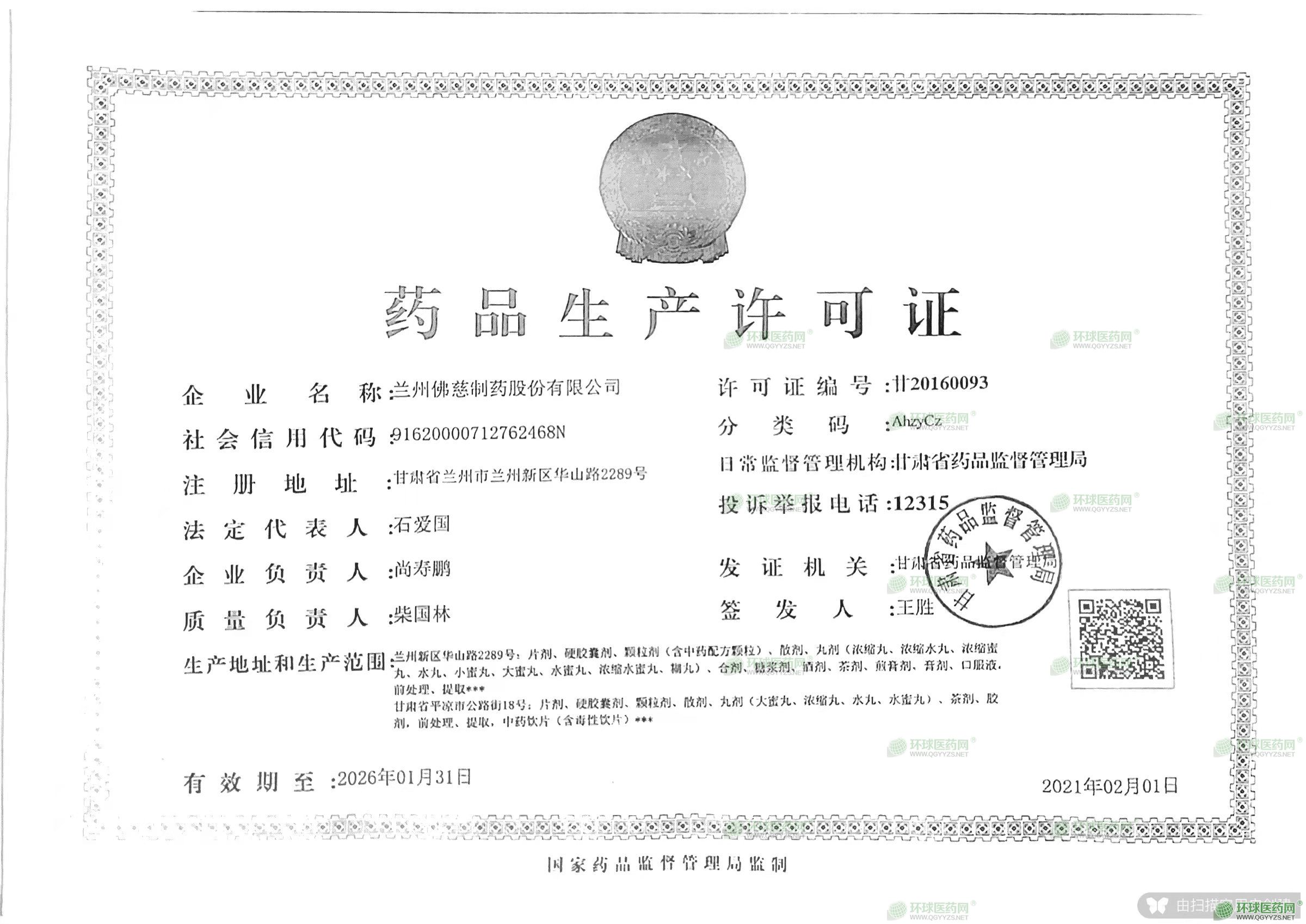 發(fā)證機關: 甘肅省藥品監(jiān)督管理局