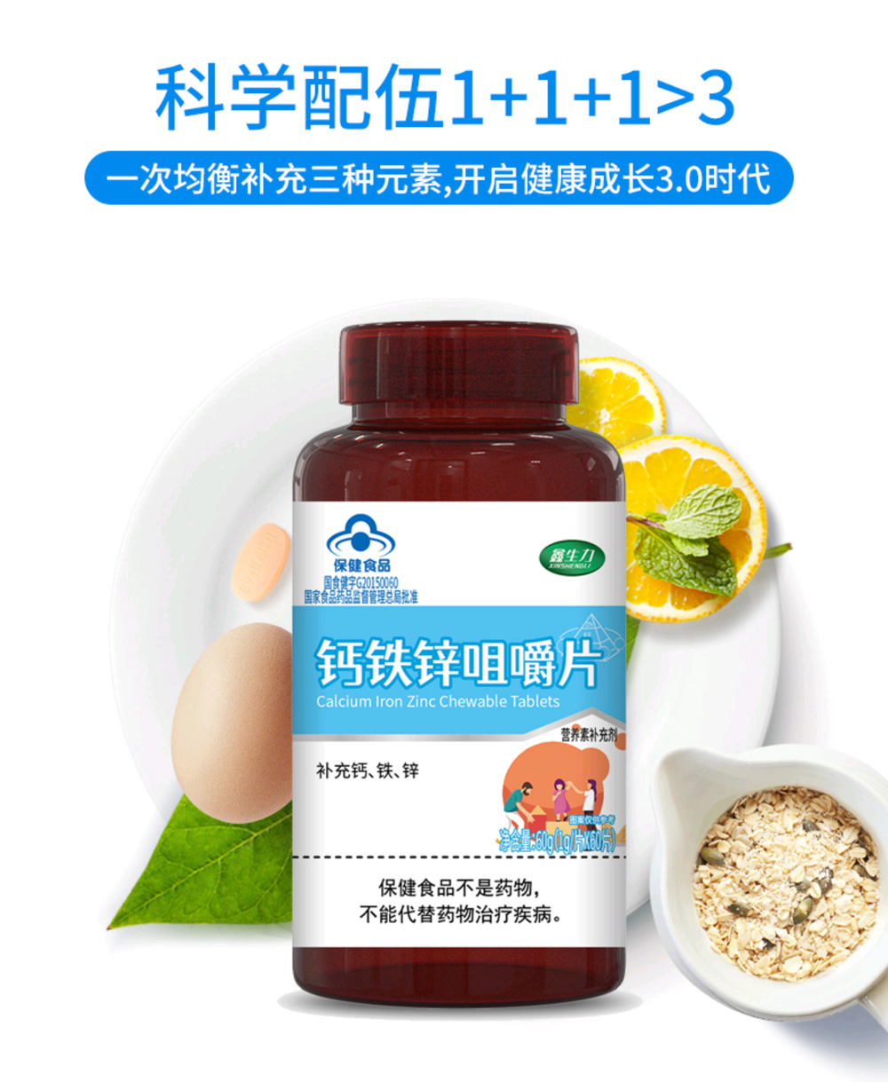 那怎么給孩子補充鈣鐵鋅呢?除了食補以外,服用山東昱健生物科技有限公司的鑫生力鈣鐵鋅咀嚼片也是一種較好的辦法。