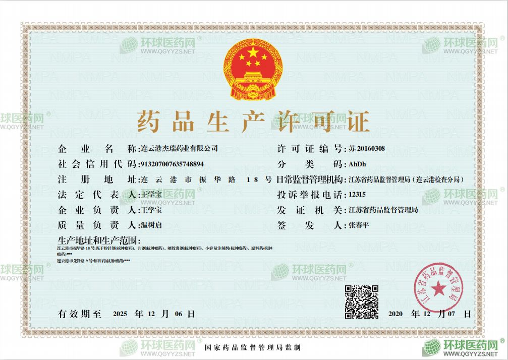 生產(chǎn)范圍: 原料藥(抗腫瘤藥)***連云港市振華路18號 凍干粉針劑(抗腫瘤藥),片劑(抗腫瘤藥),硬膠囊劑(抗腫瘤藥),小容量注射劑(抗腫瘤藥),原料藥(抗腫瘤藥)***