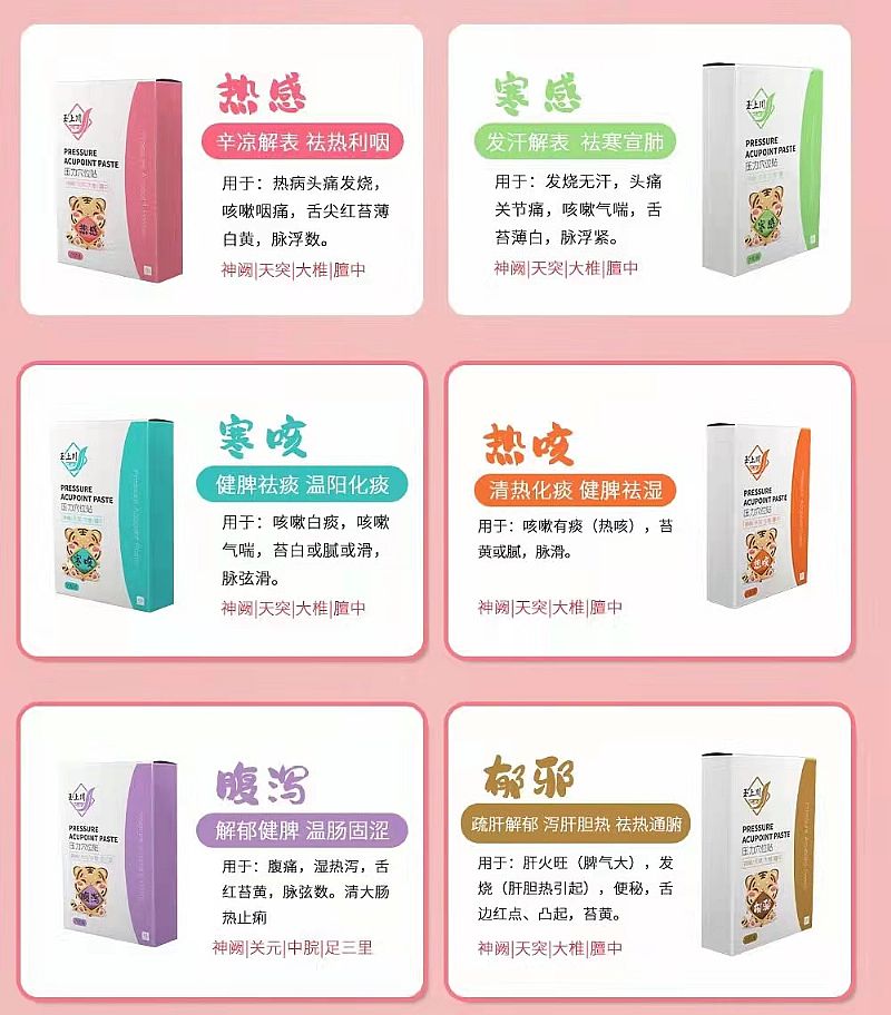 產(chǎn)品用途: 根據(jù)中醫(yī)辨證區(qū)分用于熱性感冒發(fā)燒、寒性感冒發(fā)燒、肝膽性感冒發(fā)燒,針對(duì)不同類(lèi)型對(duì)應(yīng)穴位貼和穴位。