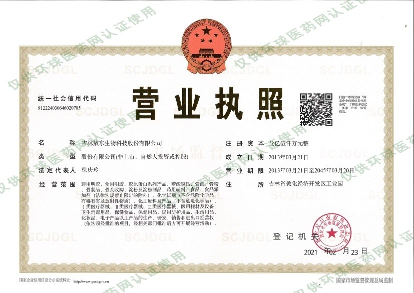 吉林敖東生物科技股份有限公司成立于2013年03月21日,注冊地位于吉林省敦化經(jīng)濟開發(fā)區(qū)工業(yè)園,法定代表人為徐慶玲。經(jīng)營范圍包括藥用明膠、食用明膠、膠原蛋白系列產(chǎn)品、磷酸氫鈣、骨油、骨粉、骨制品、骨頭收購、淀粉及淀粉制品、藥用輔料、食品、食品添加劑(法律法規(guī)禁止限定的除外)、化學(xué)試劑(不含危險化學(xué)品、有毒有害及放射性物質(zhì))、化工原料及產(chǎn)品(不含危險化學(xué)品)、Ⅰ類醫(yī)療器械、Ⅱ類醫(yī)療器械、Ⅲ類醫(yī)療器械、醫(yī)用耗材及設(shè)備、衛(wèi)生消毒用品、保健食品、保健用品、民用防護用品、生活用品、化妝品、電子產(chǎn)品以上產(chǎn)品的生產(chǎn)、研發(fā)、銷售和進(jìn)出口經(jīng)營權(quán)(依法須經(jīng)批準(zhǔn)的項目,經(jīng)相關(guān)部門批準(zhǔn)后方可開展經(jīng)營活動)