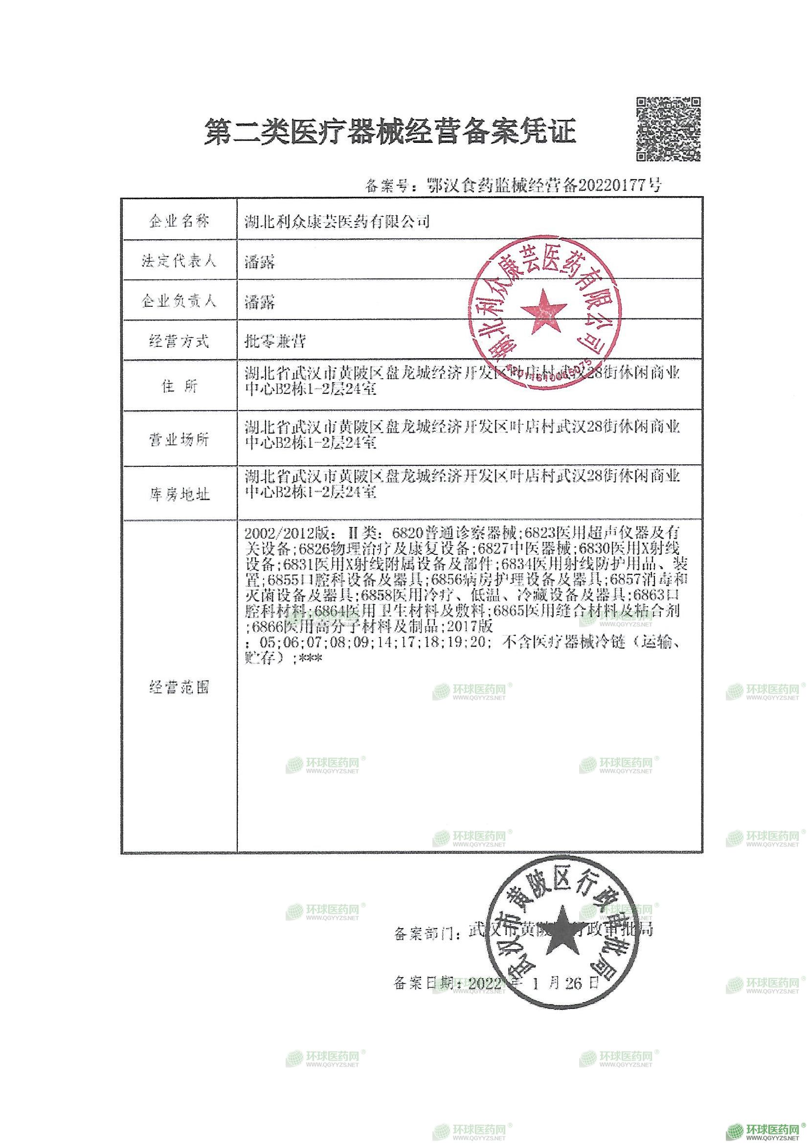湖北利眾康蕓醫(yī)藥有限公司成立于2022年01月18日,注冊地位于湖北省武漢市黃陂區(qū)盤龍城經濟開發(fā)區(qū)葉店村武漢28街休閑商業(yè)中心B2棟1-2層24室,法定代表人為潘露。經營范圍包括一般項目:第二類醫(yī)療器械銷售;特殊醫(yī)學用途配方食品銷售;醫(yī)用口罩零售;日用口罩(非醫(yī)用)銷售;衛(wèi)生用品和一次性使用醫(yī)療用品銷售;消毒劑銷售(不含危險化學品);化妝品零售;個人衛(wèi)生用品銷售;日用品銷售;母嬰用品銷售;互聯網銷售(除銷售需要許可的商品);**類醫(yī)療器械銷售;醫(yī)用口罩批發(fā);化妝品批發(fā);食品銷售(僅銷售預包裝食品)(已備案);保健食品(預包裝)銷售(已備案)(除依法須經批準的項目外,憑營業(yè)執(zhí)照依法自主開展經營活動)許可項目:藥品零售;藥品批發(fā)(依法須經批準的項目,經相關部門批準后方可開展經營活動,具體經營項目以相關部門批準文件或許可證件為準)
