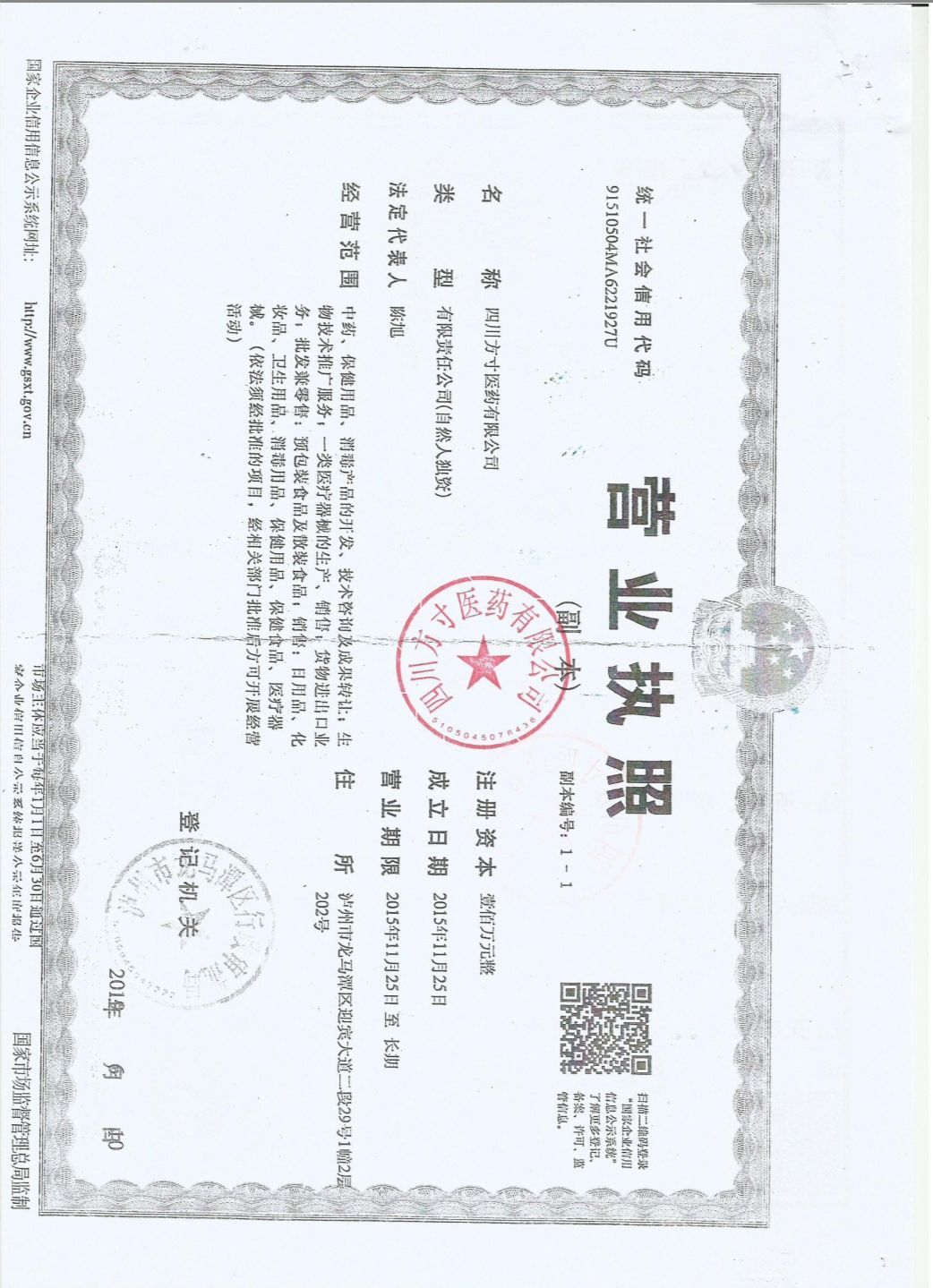 四川方寸醫(yī)藥有限公司成立于2015年11月25日,注冊地位于瀘州市龍馬潭區(qū)迎賓大道二段29號(hào)3幢2層2號(hào)(自主申報(bào)),法定代表人為陳旭。經(jīng)營范圍包括中藥、保健用品、消毒產(chǎn)品的開發(fā)、技術(shù)咨詢及成果轉(zhuǎn)讓;生物技術(shù)推廣服務(wù);一類醫(yī)療器械的生產(chǎn)、銷售;貨物進(jìn)出口業(yè)務(wù);批發(fā)兼零售:預(yù)包裝食品及散裝食品;銷售:日用品、化妝品、衛(wèi)生用品、消毒用品、保健用品、保健食品、醫(yī)療器械。(依法須經(jīng)批準(zhǔn)的項(xiàng)目,經(jīng)相關(guān)部門批準(zhǔn)后方可開展經(jīng)營活動(dòng))