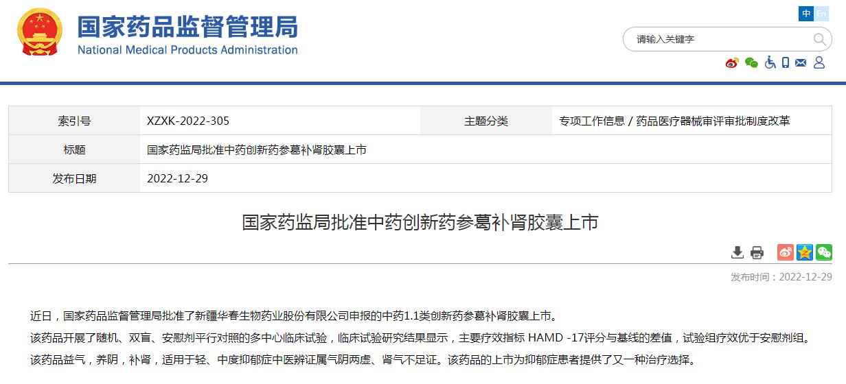 國家藥品監(jiān)督管理局于2022年12月29日批準(zhǔn)新疆華春生物藥業(yè)股份有限公司(以下簡稱華春藥業(yè))1.1類中藥創(chuàng)新藥抗抑郁癥“參葛補(bǔ)腎膠囊”上市許可,批準(zhǔn)證書編號(hào):2022S01214;藥品批準(zhǔn)文號(hào):國藥準(zhǔn)字Z20220008。