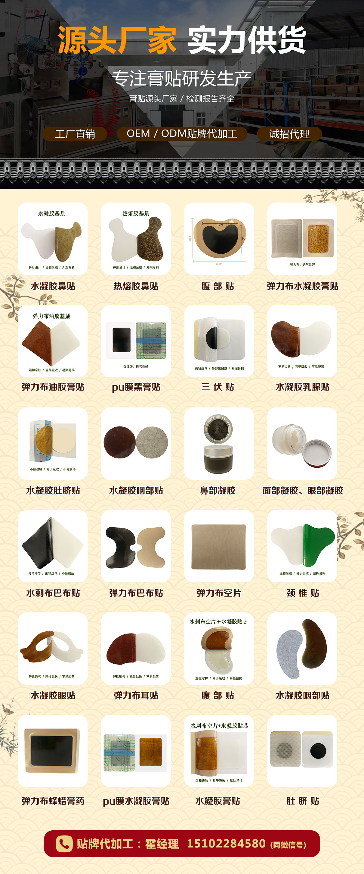 眾多代理商將投資重心放在此類產(chǎn)品上,同時(shí),也有不少企業(yè)有著特別的需求,想要找專業(yè)、高效、有實(shí)力的廠家進(jìn)行膏藥OEM貼牌代工。