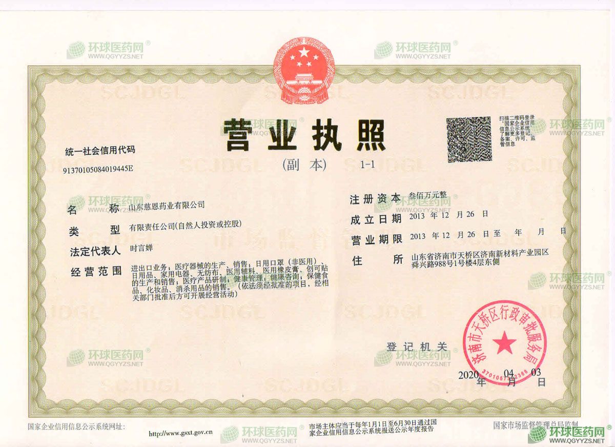 山東慈恩藥業(yè)有限公司成立于2013年12月26日,注冊地位于山東省濟(jì)南市天橋區(qū)濟(jì)南新材料產(chǎn)業(yè)園區(qū)舜興路988號1號樓4層?xùn)|側(cè),法定代表人為于程成。經(jīng)營范圍包括進(jìn)出口業(yè)務(wù);醫(yī)療器械的生產(chǎn)、銷售;日用口罩(非醫(yī)用)、日用品、家用電器、無紡布、醫(yī)用輔料、醫(yī)用橡皮膏、創(chuàng)可貼的生產(chǎn)和銷售;醫(yī)療產(chǎn)品研制;健康管理;健康咨詢;保健食品、化妝品、消殺用品的銷售。(依法須經(jīng)批準(zhǔn)的項(xiàng)目,經(jīng)相關(guān)部門批準(zhǔn)后方可開展經(jīng)營活動)