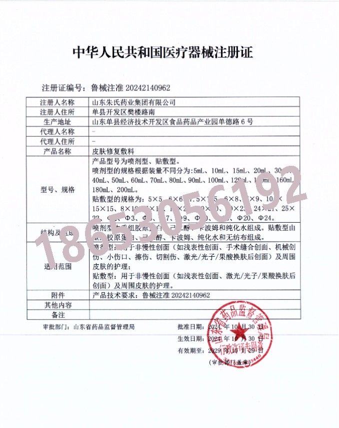 在皮膚醫(yī)療領(lǐng)域持續(xù)創(chuàng)新的山東朱氏藥業(yè)集團(tuán)近日再傳捷報(bào),其自主研發(fā)的新型皮膚修復(fù)敷料正式獲得國家藥品監(jiān)督管理局頒發(fā)的醫(yī)療器械注冊證(注冊證編號(hào):魯械注準(zhǔn)2023xxxxxx)。這標(biāo)志著企業(yè)在皮膚修復(fù)領(lǐng)域的技術(shù)實(shí)力再獲國家權(quán)威認(rèn)可,為臨床皮膚損傷修復(fù)提供了更專業(yè)的解決方案。