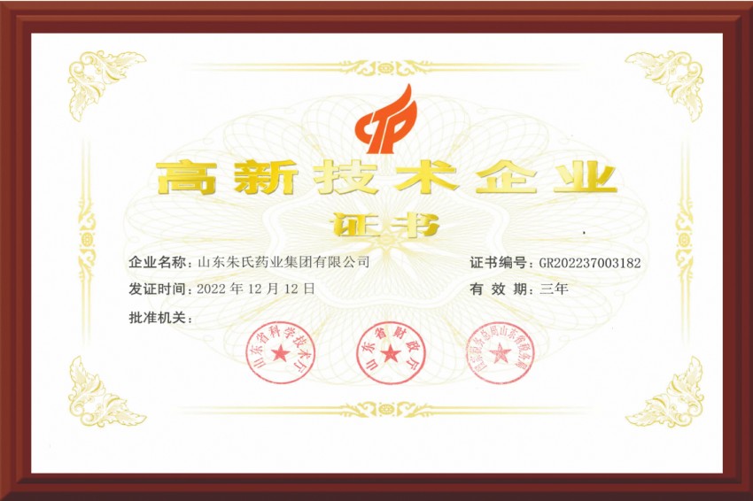 權(quán)威認(rèn)證!山東朱氏藥業(yè)集團(tuán)榮膺國家級(jí)“高新技術(shù)企業(yè)”稱號(hào)