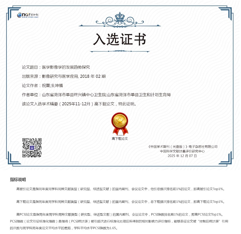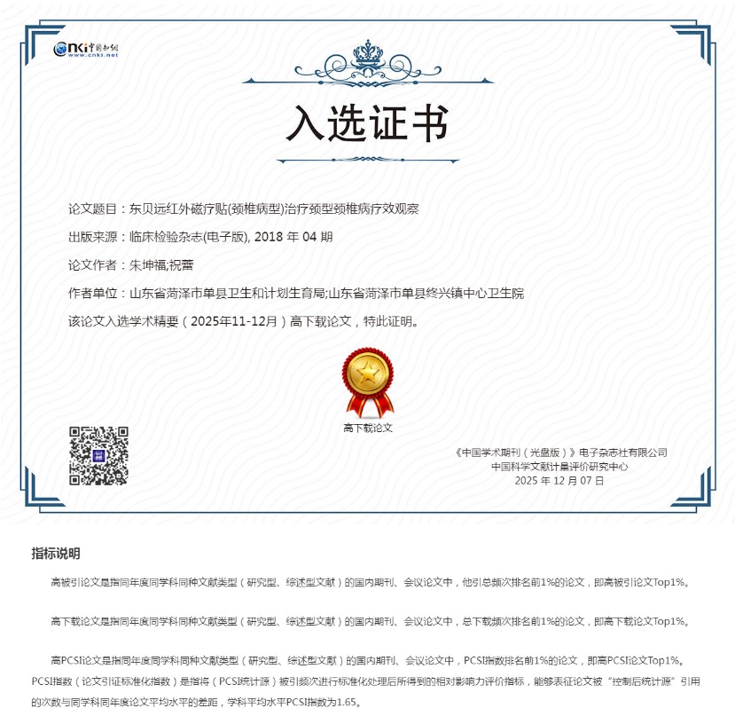 合作成果亮眼:兩篇論文躋身 “高下載 Top1%” 此次入選高下載論文的兩篇合作成果,聚焦醫(yī)療技術(shù)與臨床應(yīng)用領(lǐng)域:其中《醫(yī)學(xué)影像學(xué)的發(fā)展趨勢探究》刊載于《影像研究與醫(yī)學(xué)應(yīng)用》;《東貝遠(yuǎn)紅外磁療貼 (頸椎型) 治療頸型頸椎病療效觀察》發(fā)表在《臨床檢驗雜志》。而根據(jù)證書指標(biāo)說明,“高下載論文” 是指同年度同學(xué)科同類型文獻中總下載頻次排名前 1% 的成果,此次兩篇論文的入選,也直接體現(xiàn)出它們在行業(yè)內(nèi)的高關(guān)注度與實用價值。