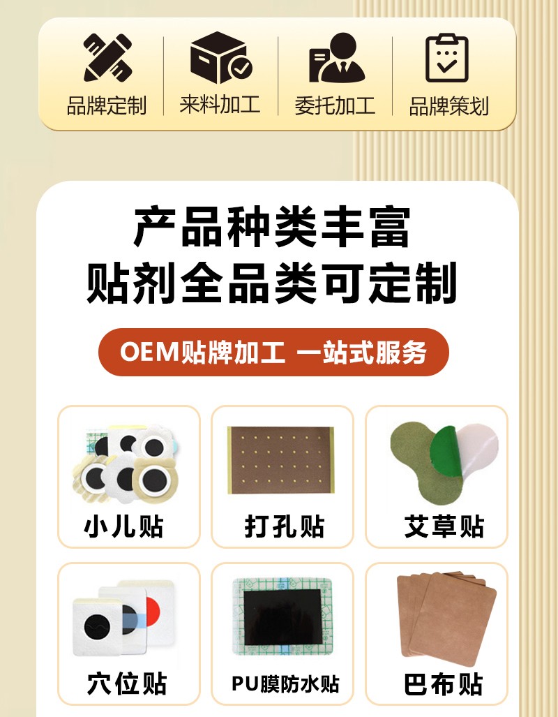 定制化服務(wù):包裝設(shè)計(jì)、貼劑類型(水凝膠、無紡布等)及起訂量(1萬貼起)靈活可選。
