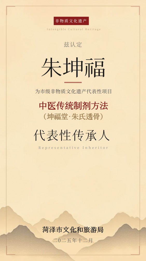 一項關(guān)乎菏澤中醫(yī)藥文化傳承的重要認定正式揭曉。 經(jīng)菏澤市文化和旅游局嚴格評審與公示,朱坤福先生正式被認定為市級非物質(zhì)文化遺產(chǎn)代表性項目“中醫(yī)傳統(tǒng)制劑方法(坤福堂·朱氏透骨膏)”的代表性傳承人。