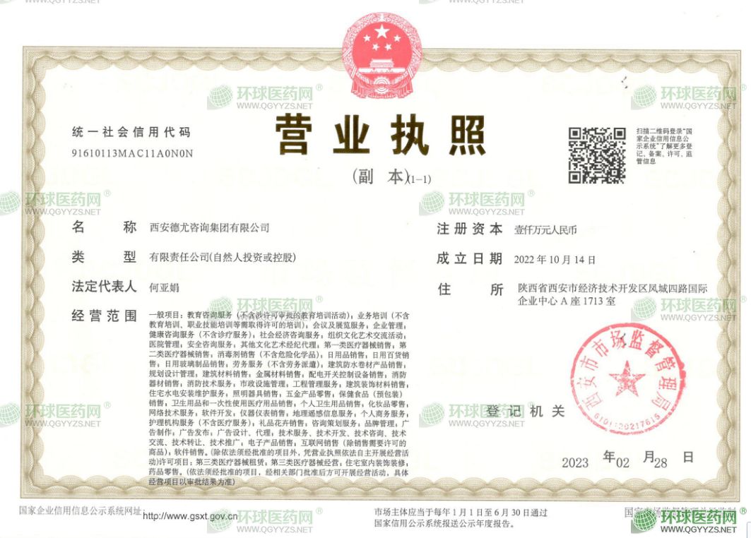 西安德尤咨詢集團(tuán)有限公司成立于2022年10月14日,注冊(cè)地位于陜西省西安市經(jīng)濟(jì)技術(shù)開發(fā)區(qū)鳳城四路國際企業(yè)中心A座1713室,法定代表人為何亞娟。經(jīng)營范圍包括-般項(xiàng)目:教育咨詢服務(wù)(不含涉許可審批的教育培訓(xùn)活動(dòng));業(yè)務(wù)培訓(xùn)(不含教育培訓(xùn)、職業(yè)技能培訓(xùn)等需取得許可的培訓(xùn));會(huì)議及展覽服務(wù);企業(yè)管理;健康咨詢服務(wù)(不含診療服務(wù));社會(huì)經(jīng)濟(jì)咨詢服務(wù);組織文化藝術(shù)交流活動(dòng);醫(yī)院管理;**咨詢服務(wù);其他文化藝術(shù)經(jīng)紀(jì)代理;**類醫(yī)療器械銷售;第二類醫(yī)療器械銷售;消毒劑銷售(不含危險(xiǎn)化學(xué)品);日用品銷售;日用百貨銷售;日用玻璃制品銷售;勞務(wù)服務(wù)(不含勞務(wù)派遣);建筑防水卷材產(chǎn)品銷售;規(guī)劃設(shè)計(jì)管理;建筑材料銷售;金屬材料銷售;配電開關(guān)控制設(shè)備銷售;消防器材銷售;消防技術(shù)服務(wù);市政設(shè)施管理;工程管理服務(wù);建筑裝飾材料銷售;住宅水電安裝維護(hù)服務(wù);照明器具銷售;五金產(chǎn)品零售;保健食品(預(yù)包裝)銷售;衛(wèi)生用品和一次性使用醫(yī)療用品銷售;個(gè)人衛(wèi)生用品銷售;化妝品零售;網(wǎng)絡(luò)技術(shù)服務(wù);軟件開發(fā);儀器儀表銷售;地理遙感信息服務(wù);個(gè)人商務(wù)服務(wù);護(hù)理機(jī)構(gòu)服務(wù)(不含醫(yī)療服務(wù));禮品花卉銷售;咨詢策劃服務(wù);品牌管理;廣告制作;廣告發(fā)布;廣告設(shè)計(jì)、代理;技術(shù)服務(wù)、技術(shù)開發(fā)、技術(shù)咨詢、技術(shù)交流、技術(shù)轉(zhuǎn)讓、技術(shù)推廣;電子產(chǎn)品銷售;互聯(lián)網(wǎng)銷售(除銷售需要許可的商品);軟件銷售。(除依法須經(jīng)批準(zhǔn)的項(xiàng)目外,憑營業(yè)執(zhí)照依法自主開展經(jīng)營活動(dòng))許可項(xiàng)目:第三類醫(yī)療器械租賃;第三類醫(yī)療器械經(jīng)營;住宅室內(nèi)裝飾裝修;藥品零售。(依法須經(jīng)批準(zhǔn)的項(xiàng)目,經(jīng)相關(guān)部門批準(zhǔn)后方可開展經(jīng)營活動(dòng),具體經(jīng)營項(xiàng)目以審批結(jié)果為準(zhǔn))西安德尤咨詢集團(tuán)有限公司對(duì)外投資1家公司。