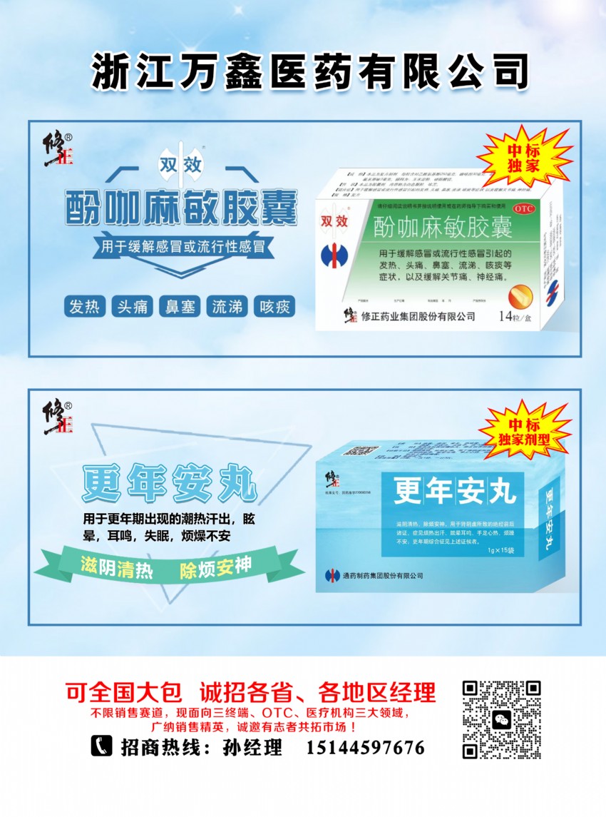 浙江萬鑫醫(yī)藥有限公司,立足浙江成熟的醫(yī)藥產(chǎn)業(yè)生態(tài),憑借嚴苛的合規(guī)管理與精準的市場布局,攜兩款“優(yōu)質(zhì)批文+醫(yī)保品種”重磅開啟全國招商——酚咖麻敏膠囊與更年安丸,以壟斷性產(chǎn)品優(yōu)勢、全維政策支持,誠邀各地醫(yī)藥代理商攜手,共享優(yōu)質(zhì)醫(yī)保品種的市場紅利!優(yōu)質(zhì)為利,醫(yī)保為穩(wěn),合規(guī)為基