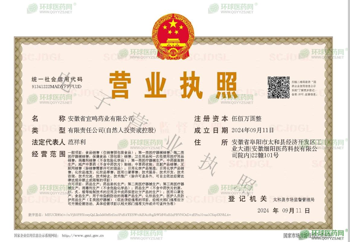 安徽省宜鳴藥業(yè)有限公司成立于2024年09月11日,注冊地位于安徽省阜陽市太和縣經濟開發(fā)區(qū)工業(yè)大道(安徽細陽醫(yī)藥科技有限公司院內)22幢101號,法定代表人為范祥利。經營范圍包括一般項目:食品銷售(僅銷售預包裝食品);**類醫(yī)療器械銷售;第二類醫(yī)療器械銷售;保健食品(預包裝)銷售;衛(wèi)生用品和一次性使用醫(yī)療用品銷售;消毒劑銷售(不含危險化學品);**類醫(yī)療器械生產;中藥提取物生產;地產中草藥(不含中藥飲片)購銷;中草藥收購;農副產品銷售;互聯(lián)網銷售(除銷售需要許可的商品);日用化學產品制造;日用化學產品銷售;化妝品批發(fā);化妝品零售;醫(yī)用口罩零售;技術服務、技術開發(fā)、技術咨詢、技術交流、技術轉讓、技術推廣(除許可業(yè)務外,可自主依法經營法律法規(guī)非禁止或限制的項目)許可項目:藥品生產;藥品委托生產;第二類醫(yī)療器械生產;第三類醫(yī)療器械生產;消毒劑生產(不含危險化學品);藥品生產(不含中藥飲片的蒸、炒、炙、煅等炮制技術的應用及中成藥保密處方產品的生產);醫(yī)用口罩生產;食品生產;用于傳染病防治的消毒產品生產;化妝品生產;醫(yī)護人員防護用品生產(Ⅱ類醫(yī)療器械)(依法須經批準的項目,經相關部門批準后方可開展經營活動,具體經營項目以相關部門批準文件或許可證件為準)