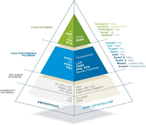 Xydar® 液晶聚合物 (LCP) –高流動性、高溫度的塑料,HDT為570℉(300℃),且具有極強的耐化學性。
